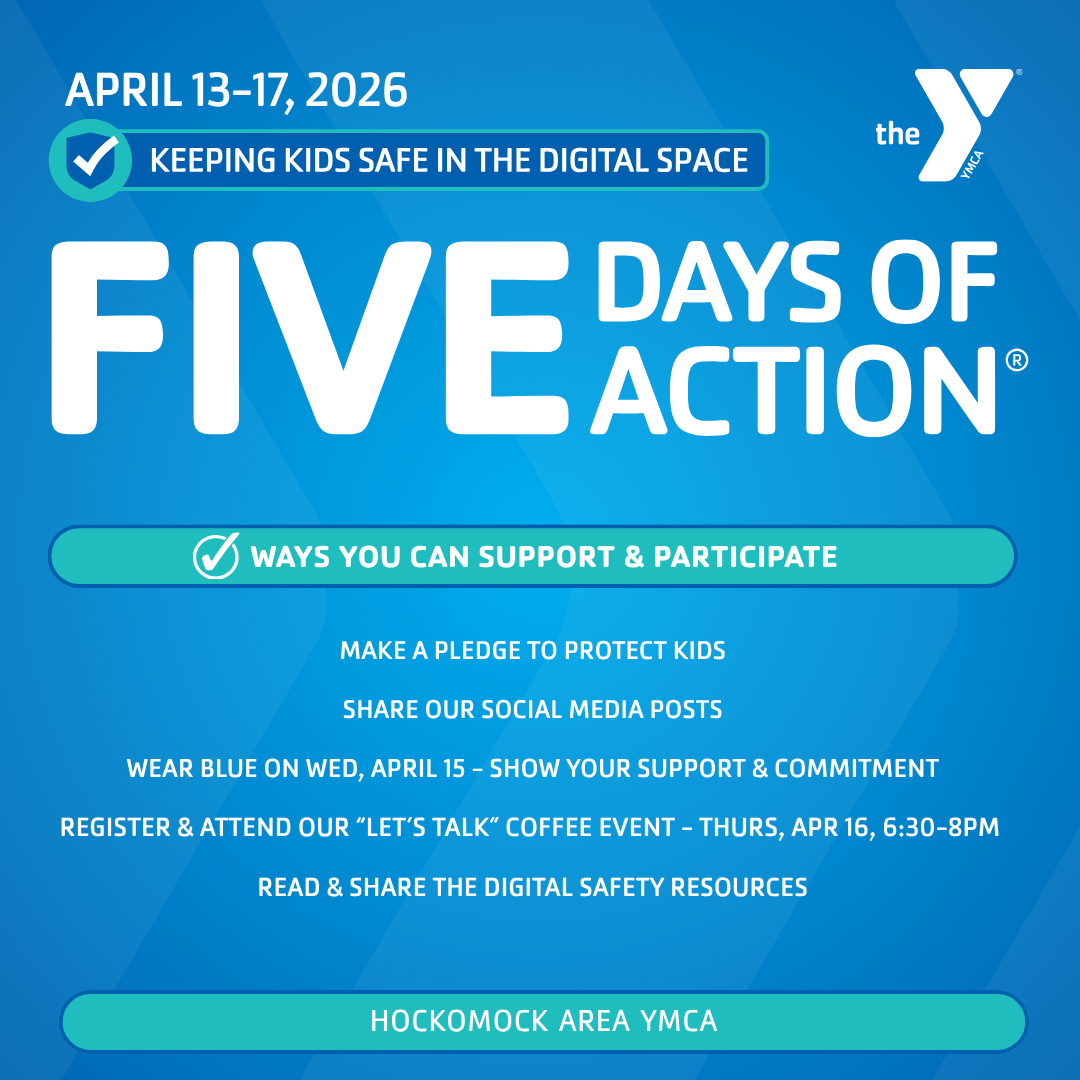 Join us for “Five Days of Action” – April 13-17, 2026, a national YMCA campaign designed to raise awareness, inspire and educate adults on how to take action and protect children, both online and offline, from sexual abuse. This year we’re focusing on digital safety, helping kids navigate the online world safely.